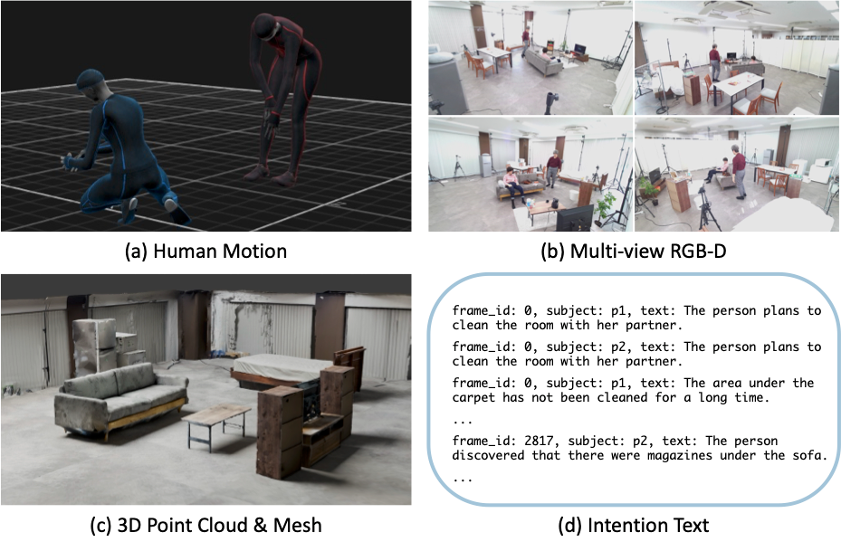 図2: I2Mに含まれるデータの種類。(a) 3D動作、(b) マルチビューRGB-D映像、(c) 3Dシーンの点群とメッシュ、(d) 意図テキスト