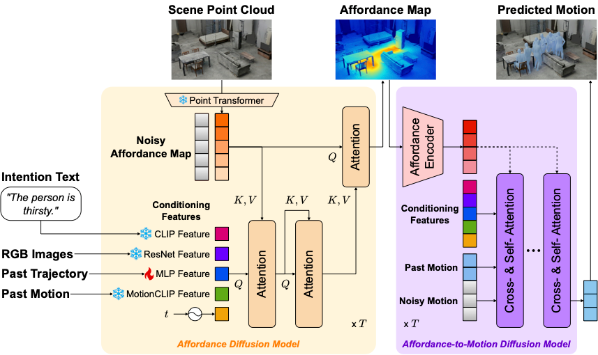 I2Mデータセットの有用性を検証するため、意図に基づいて動作を生成するベースライン手法も提案しました。具体的には以下の図にあるような、AffordMotion (Wang et al., CVPR 2024)を拡張した拡散モデルベースの手法です 。このモデルは、過去の動作やシーンの点群情報に加え、「意図テキスト」や「RGB画像」を条件として入力することで、周囲の環境と本人の意図の両方を考慮した自然な未来動作を生成します。