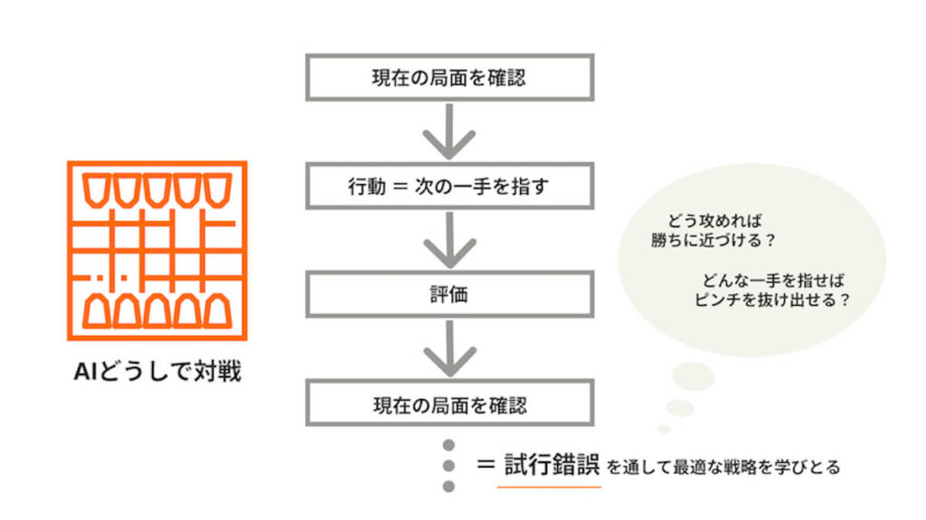 将棋や囲碁のプロフェッショナルにAIが勝利して話題になりましたが、ここでAIがよりよい一手を選択することを支えているのが強化学習なのです。